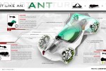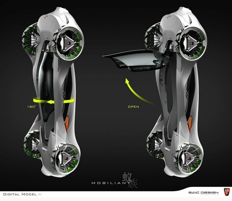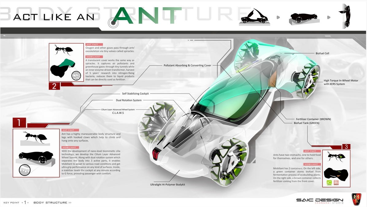 Inspired by a simple ant’s distinctive body structure and the mutually beneficial relationship between ants and trumpet trees, SAIC Motors designed Roewe “Mobiliant.” Mobiliant is a single-seat vehicle for urban public transit, which helps improve both transportation and operation efficiency for future urban ecological systems.