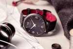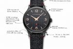 A limited edition of 100 ultra-thin pieces in microblasted DLC steel soberly clad in a houndstooth pattern dial with a slate-coloured cashmere strap lined with red alligator leather.