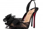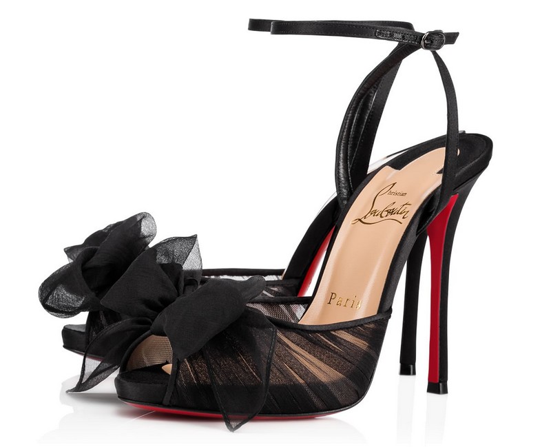 Christian Louboutin is enamored with bows and how they are used to accentuate the female form. The toe of “Artydiva” is a billowing hand-tied bow in black mousseline casting a feminine spell on this 120mm sandal in delicate crepe satin.