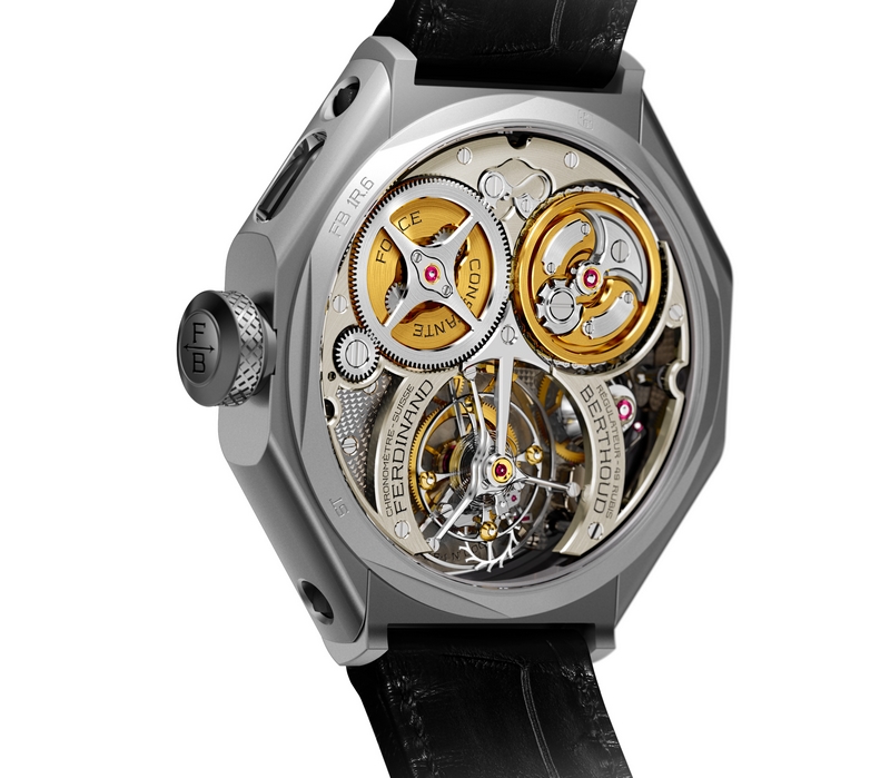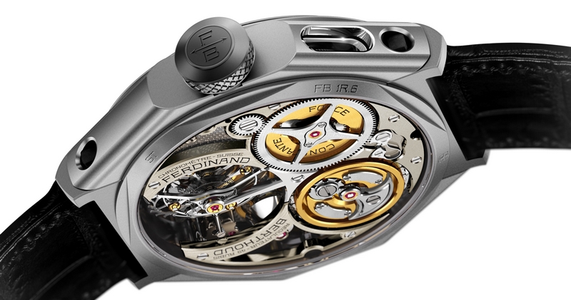 A rare and unusual-looking timepiece, the Chronomètre Ferdinand Berthoud FB 1R.6-1 is a comprehensive horological work, issued in a 20-piece limited edition intended for discerning and passionate luxury watch collectors. Its FB-T.FC.R tourbillon calibre with fusee-and-chain transmission can be admired through a sapphire crystal case-back and two lateral portholes, offering a unique view inside this outstanding chronometer.