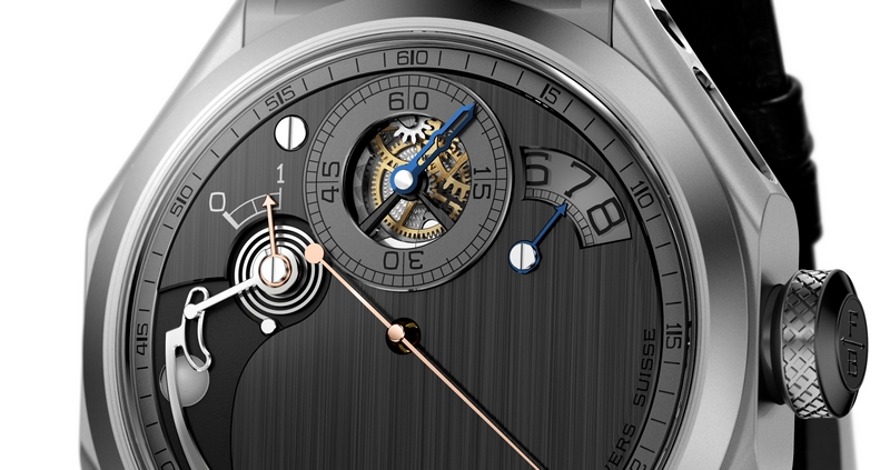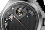 It is made of nickel silver, vertically satin-brushed by hand and black rhodium-plated. Of the three small apertures, the first serves to show the hours, offset at 2 o’clock and appearing on a glare-proofed sapphire crystal disc bearing transferred Arabic numerals striking a pleasing contrast with a white background. The second opening features an original power-reserve display mechanism, distinguished by a large dial cut-out revealing part of the finely sandblasted and black rhodium-plated mainplate. Located in the centre of the finely chamfered, bead-blasted and black rhodium-plated minutes counter, the third aperture displays a hand-engraved “pyramid” motif inspired by an openworked Ferdinand Berthoud astronomical clock belonging to the L.U.CEUM collection.