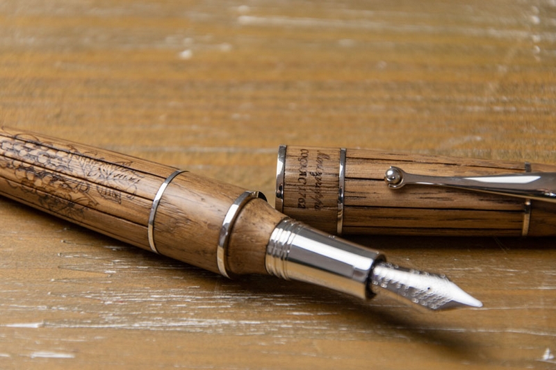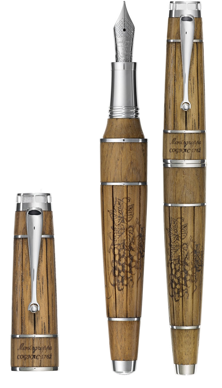 Using natural Limousin oak, the Montegrappa Cognac Hors d’Age has been carved to mimic the curvature and stave construction of the cognac barrel, with sterling silver trims mimicking its hoops. Pyrogravure detailing lends cellar character to the pen’s barrel and cap: both have been engineered to align perfectly.