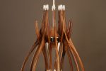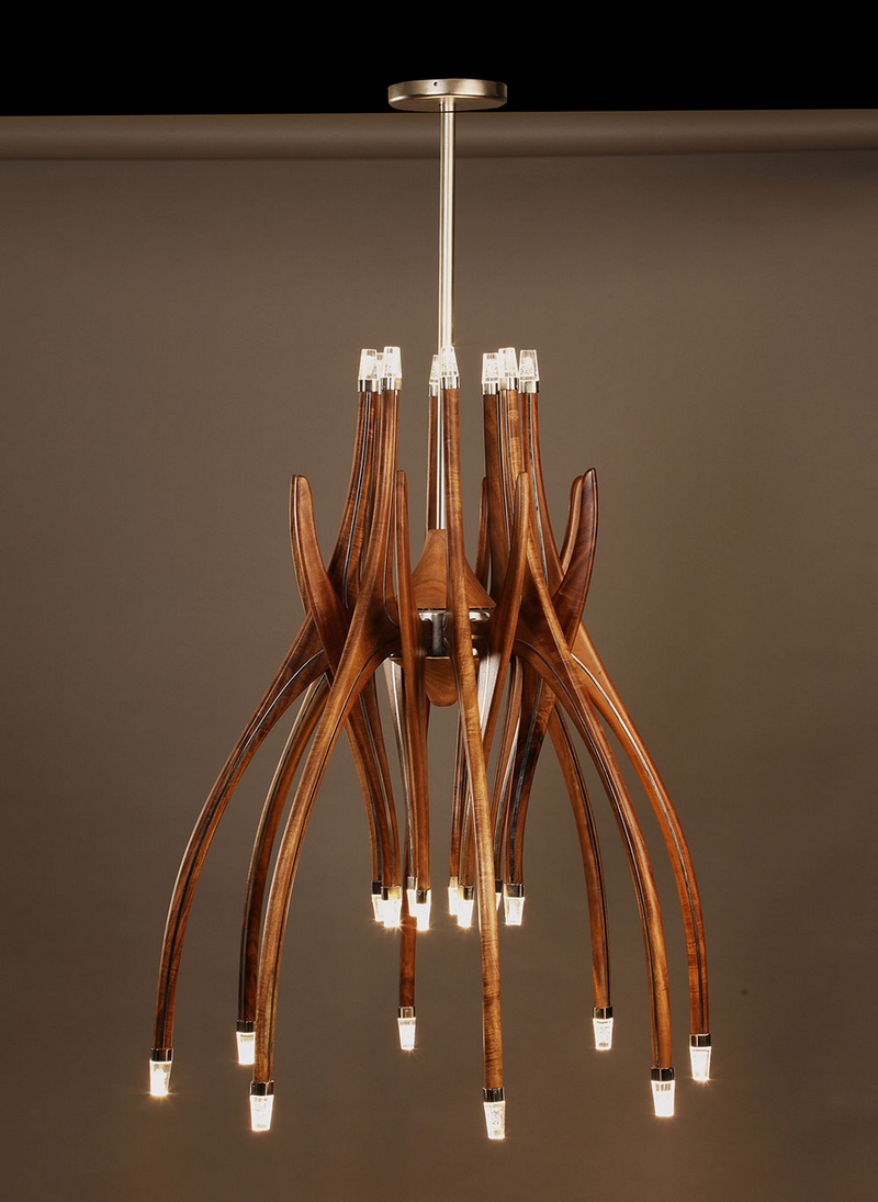 Caribou – Rethinking chandeliers in today’s modern context of living. A lighting installation designed for modern homes – challenging the conventional aesthetics of ornamentation in lighting. Created using the concept of a kit of parts. The lighting configuration allows for the customization of parts and arraying into a form either radially or in a linear manner – eliminating wires in the lighting unit. Created to drive a new expression in lighting design this product is designed with ‘metal ornamental inlay’ that drives the aesthetic expression and functionally allows for power transmission to illuminate the light source. This makes assembling a chandelier very convenient with no hassle of wiring. Inspired by antlers of a deer, a crafted wood chandelier with laser etched crystal light units. A new interpretation of ornamentation using natural finishes of wood.