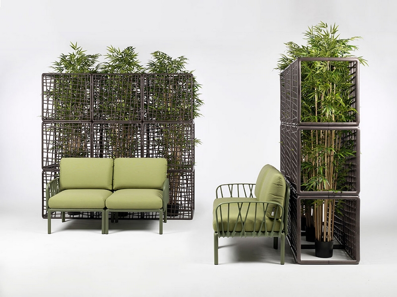 Regenerating used plastic: the modular partition arising from the REGENERATION project Komodo EcoWall (designed by Raffaello Galiotto) is the first Nardi product made of regenerated material obtained from the recovery of Nardi’s and other plastic products at the end of their life cycle. This repositionable modular partition, made of regenerated resin, has been designed to separate outdoor spaces. The individual modules can be configured vertically and horizontally as required to create different layouts, enhance the aesthetic look of outdoor spaces and provide privacy. The structure has a recurrent elegant lattice pattern reminiscent of tree branches. Plants and flowers can be arranged within the empty space of the modules to create a natural backdrop effect, making open-air spaces stylish and adding contemporary appeal.