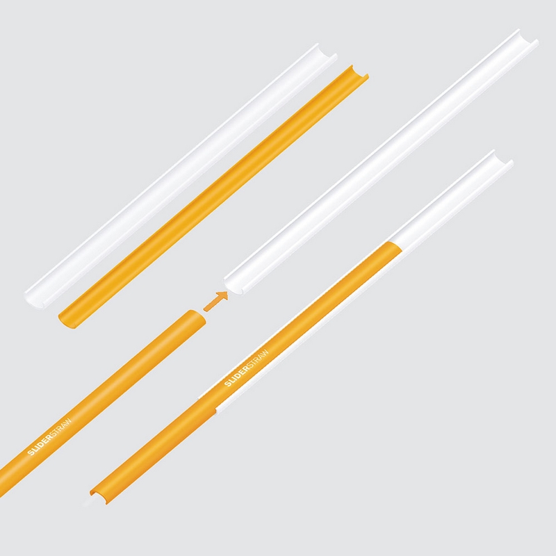 Sliderstraw is a reusable drinking straw made of robust plastics. Thanks to its patented design, each straw consists of two parts which can easily be connected. After use, the two parts can be put into the dishwasher individually for perfectly hygienic cleaning – something that is not possible with conventional disposable straws due to their small diameter. The oval drinking straws are available