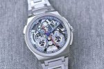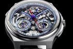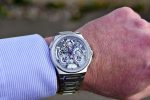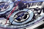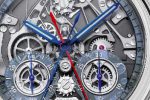 This luxury watch model features traditionally blued hands that harmonise well with the weave of metallic greys inside the open-worked watch. A closer look reveals a fumé blue shimmer emanating from the minute track and the two totalizer tracks. The effect is produced by the use of sapphire crystal rings that have been treated with metal oxides applied by an evaporation process.