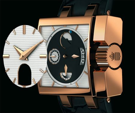 Instrumento No Uno, the very first watch for De Grisogono, the watch set the standard for the now highly successful brand. The watch features a square case and slightly arced sides, a second time zone indicator and a large date aperture at 7.30. The grooved crown is set with with a black diamond and the movement used an automatic modified calibre.