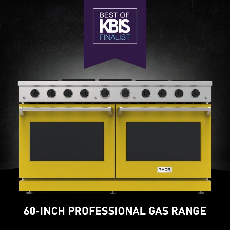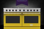 THOR Kitchen released its largest appliance: a massive 60-inch range with dual 30-inch ovens. The 60-Inch Professional Gas Range is the first and only THOR Kitchen range available in the striking yellow colorway. In addition to eight high-powered Btu burners, a stovetop griddle and grill feature, the range is complemented by a stainless steel finish and black professional-style control knobs with blue and red LED indicator lights.