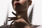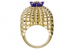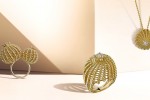 The cocktail rings and cuffs are domes of textured gold with tiny flowers of precious stones and dewdrops of diamonds.