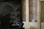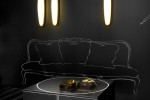 The pieces were presented in a graphic theater dominated by black in which outlines of paintings and plants are etched in white chalk intermingling with real objects.