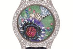 The dial of a Dior Grand Soir Botanic with an off-center movement at eight o’clock features blue, pink and yellow sapphires, emeralds, diamonds and rubies that evoke the falling of evening light.