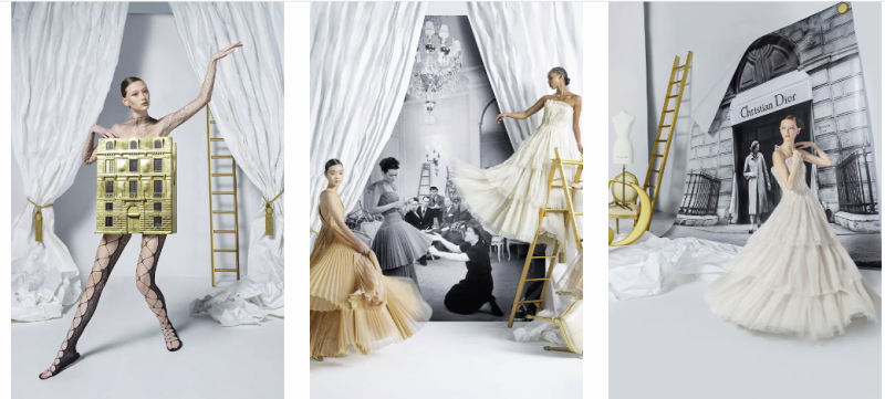 Portrayed in a poetic, minimalist decor, more contemporary than ever, tDior symbols dear to the House are unveiled in turns: the medallion chair, the letters spelling “Dior”, the emblematic Lady Dior – presented in an exclusive gold version in collaboration with the artist Penny Slinger.