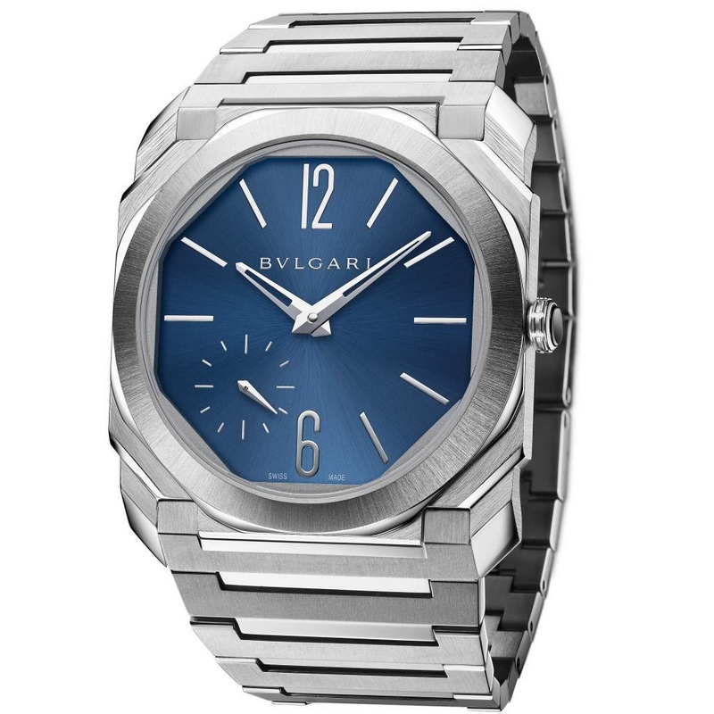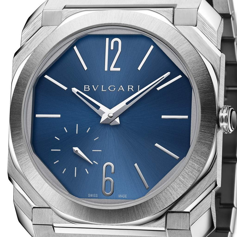 For Bvlgari watch division, the Octo Finissimo is driven by a passion for excellence, showing a remarkable attention to detail and unique expertise in all of its designs. Beyond that, it is also a story of performance. Bulgari Octo is known for its mechanical brilliance, and leverages the expertise of Swiss watchmaking to create new editions that are technical watchmaking masterpieces. The Octo Finissimo Automatic Satin-Polished Steel is offered with a polished lacquered blue dial.