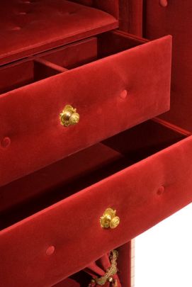 • The lower part is extremely comfortable. You’ll discover it, in complete privacy, behind the velvet curtains, held open by French passementerie tiebacks. Its jewelry shop décor will be a jewelry case for your dog.