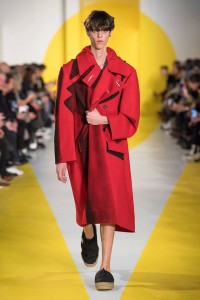 Maison Margiela Menswear Fall Winter 2018 – Double-breasted red felted wool coat with shadow play print and application