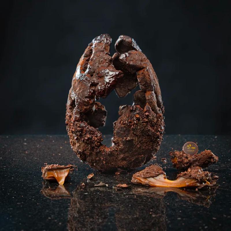 The Luko egg’s key aim is to showcase chocolate as a material in its raw state, and this is reflected in all the different chocolate-making techniques it uses. The egg is not smooth or shiny; in fact, it might have emerged straight out of the ground.