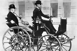 Gottlieb Daimler and his son Adolf on the motor carriage, 1886