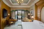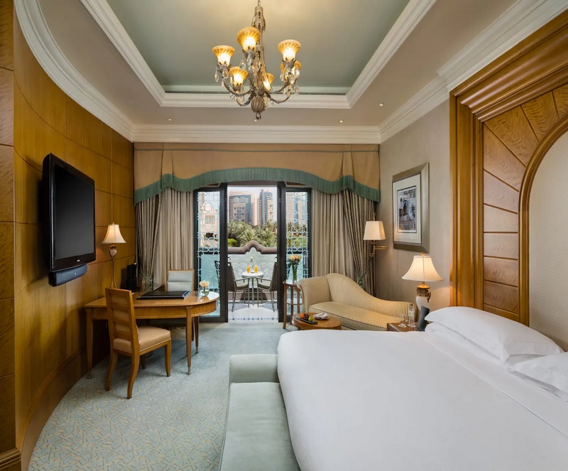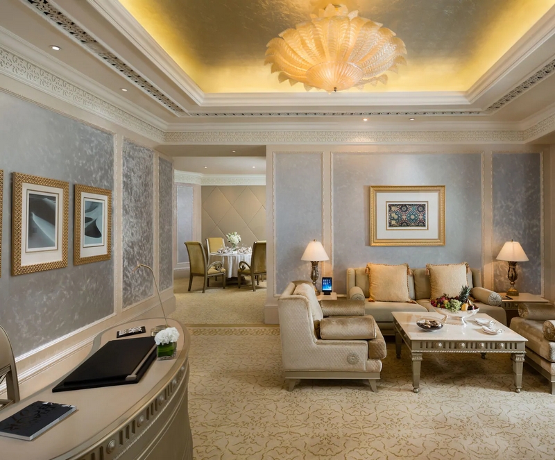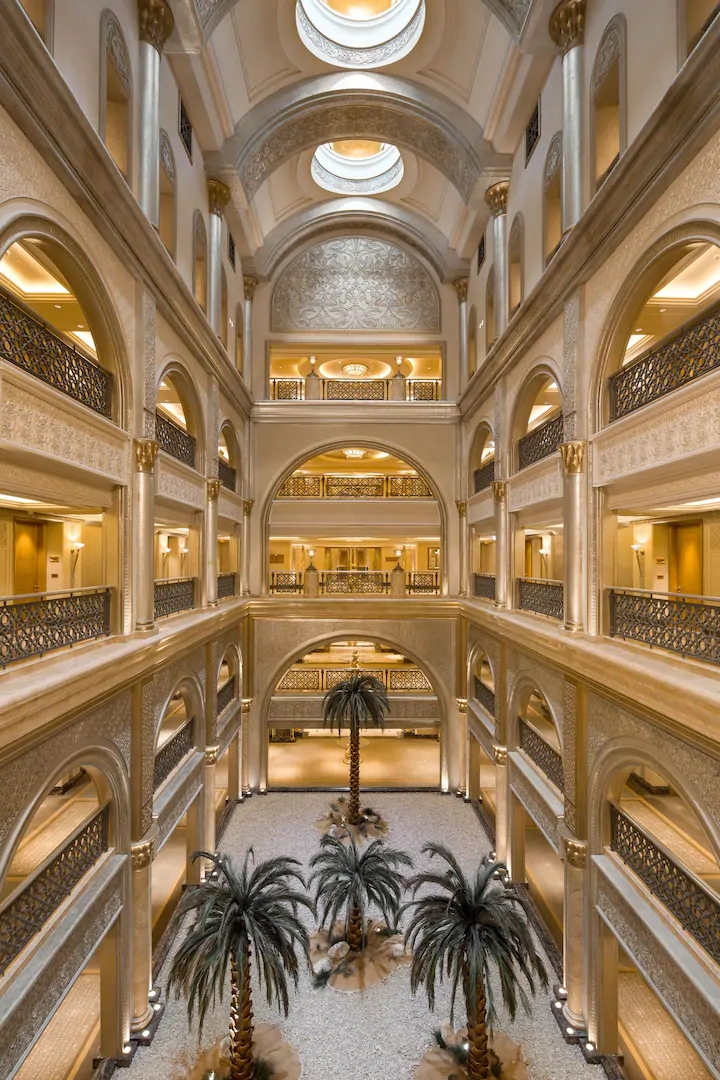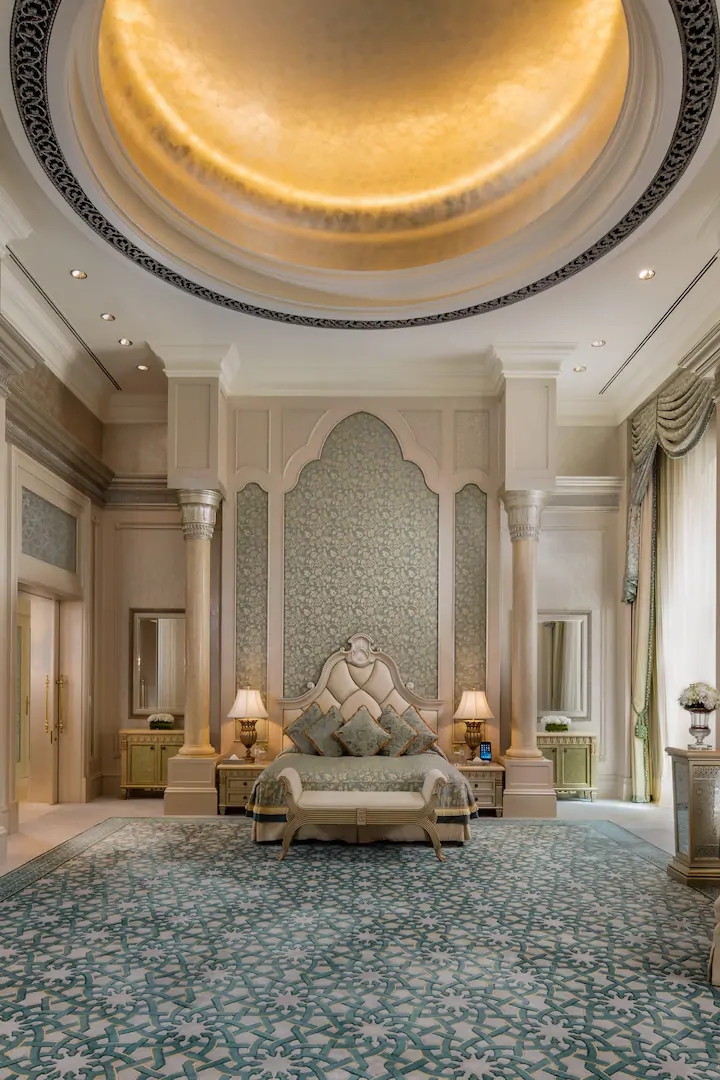 The Emirates Palace hotel sits on a 1.3-kilometre private beachfront, featuring 394 guestrooms and suites, 12restaurants and bars, 40 meeting rooms, a concert grade auditorium and a ballroom that can accommodate up to 2,500 people. Leisure facilities include a marina, two swimming pools, a spa and two fitness centres.