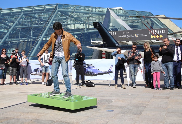 flying hoverboard which can leviate up to 25 cm. The ArcaBoard, the brainchild of engineers in New Mexico, flew in front of visitors and press on the Grimaldi Forum’s Esplanade.