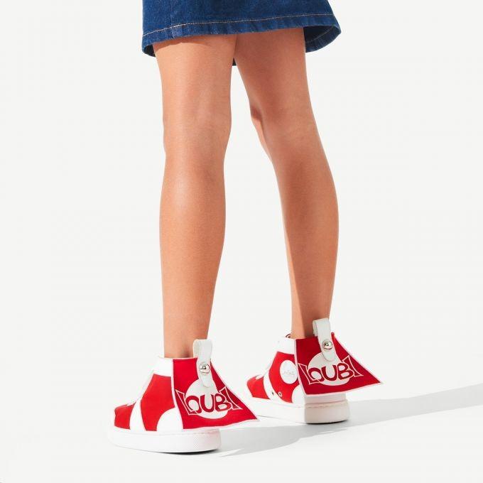 The Super Loubi high-top sneaker is crafted from white calf leather and red neoprene. This Maison Christian Louboutin model has a neoprene cape on the heel that flutters with every step just like the cape worn by the designer’s super-heroes.