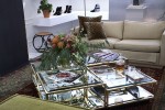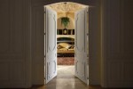 Traditional moldings adorn walls painted in a flattering shade of soft ivory, while plant arrangements suspended from the ceiling and antique rugs delineating intimate lounge areas lend warmth to flooring in parquet and burnished concrete.