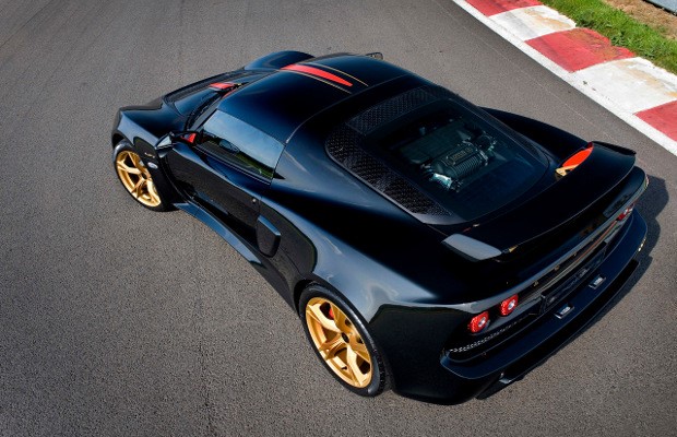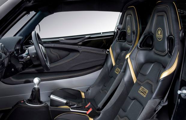 This summer 81 Lotus Exige S cars will receive a Lotus F1 Team inspired livery and interior trim to commemorate the number of grand prix victories held by the Lotus automotive marque. The Exige LF1 is delivering race-car thrills with a striking bespoke black and gold paint scheme with red accents and gold 17″ front and 18″ rear cast alloy wheels.