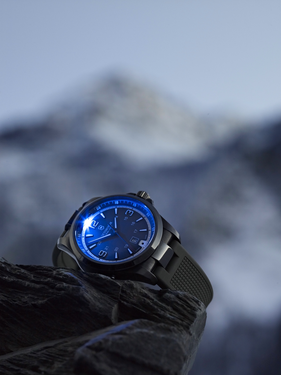 Do not ignore the darkness. Rather, learn from it, and create light with the right tool. We are more than happy that sporty classic Night Vision, a bestselling success from Victorinox, the original Swiss Army knife maker, is back with its avant-garde lighting feature and a noble mission to illuminate the darkest nights and footpaths. With this watch which first appeared in 2003, extended light, signal, optimal time reading, innovative dial illumination, locator and battery-end-of-life indication, and even a SOS rescue signal, are all at our fingertips. A true favorite for men who venture out. For 2014, the luminous and versatile Night Vision has two new expressive outfits – “Black Ice” PVD steel and black leather strap. The iconic model equipped with an exclusive LED module can, literally, see in the dark, offering six lighting functions.