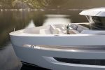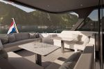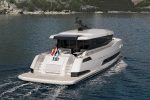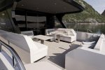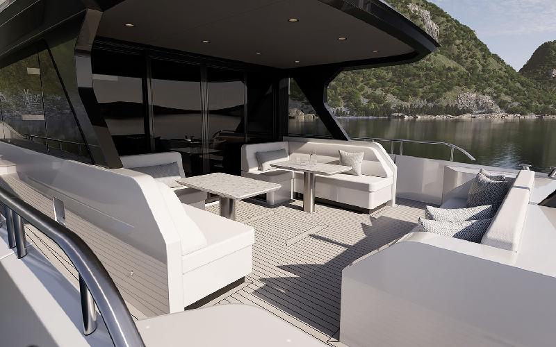 The Xtreme60 offers plenty of exterior space, with a long aft deck designed for lounging in both shade and sun, and enough room for entertaining. Wide side decks tucked behind deep, safe bulwarks run forward to a stylish foredeck lounge, featuring a drinks table, two banks of seating in matt white Sunbrella fabric, and a large forward-facing sunpad. The yacht also boasts a flexible beach club, which includes a deep, padded seat when the transom is closed, and a hydraulically operated panel that opens to reveal a deep lazarette for storing water toys, diving gear, bikes, or other equipment.