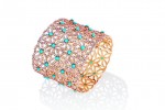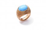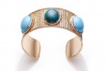 Twisted pink gold threads come together to form a textured bangle and assorted ring, set with contrasting turquoise and bluish-green chrysocolla in a colour combination that is “so” Piaget.