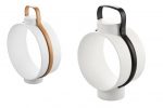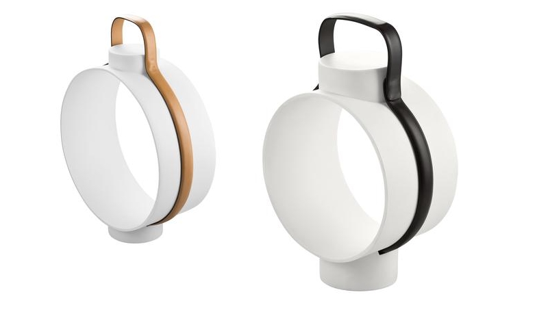 The otherwise normal lampshade of the design piece by Dante – Goods and Bads is rotated 90 degrees, thereby completely redefining the interaction between the light fitting and reflector. The delicate porcelain body is initially reminiscent of an antique lantern, but its thoroughly modern aesthetics shine through thanks to the clear-cut design and soft beam of LED light. A leather band, available in Bordeaux, dark brown or natural, serves as a handle.