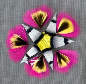 Appliqué flower motif of chicken and pheasant feathers