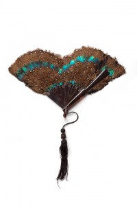 FEATHER FANS exhibition momu be-Fan with leaf in Guinea fowl feathers and Impeyan Pheasant and frame in imitation tortoise shell with silk cord and tassel, 1880-1900