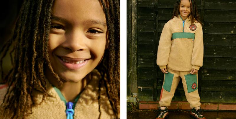 Continuing the ‘Folklore’ narrative, the collection brings to life scenes of camping and storytelling amidst nature’s embrace. Teddy-mat co-ords, patchwork trousers, camouflage recycled puffers, and warm hiking boots transport Stella boys into the heart of their own adventures. As they gather around the fire and pitch tents, they are clothed in materials that are reflective of the brand’s commitment to responsible sourcing – forest-friendly viscose, organic cotton, and recycled polyester and nylon.