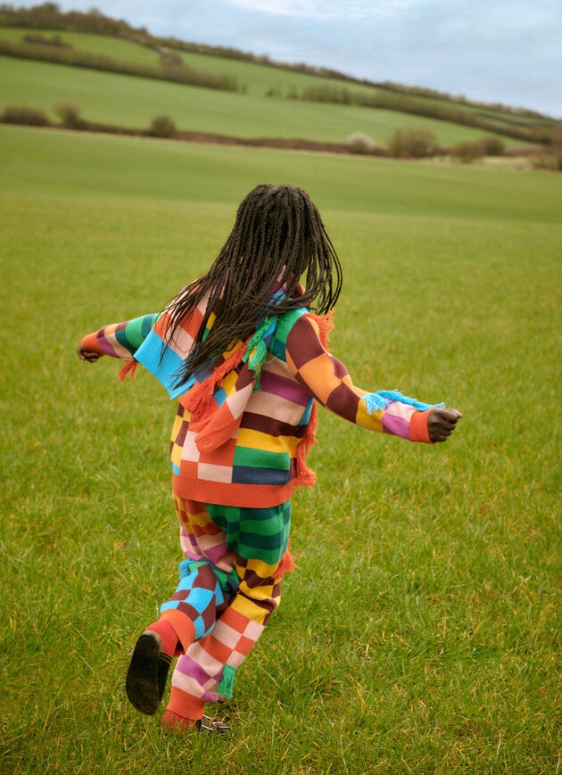 The magic of nature is further translated into the ‘Folklore’ unicorn, a stunning manifestation of floral love in a color-blocked masterpiece. From organic cotton denim to delicate flower embroidery, the collection reflects the brand’s dedication to circularity and eco-preservation. An earthy palette of forest greens, dark blues, and deep purples allows patchwork florals to bloom on kilted lightweight jackets, cable knit cardigans, check gilets, and black base organic cotton denim staples, accompanied by soft moccasin boots. This fusion of style and sustainability resonates through every thread and stitch.