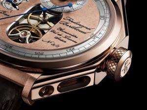 The case of the Chronomètre FB 1.2-1 is entirely made of 18-carat rose gold, as are the dial, lugs, fastening screws and three half-bridges visible through the back