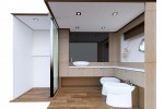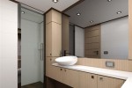 The bathroom has floor and furniture tops in walnut stained oak wood, while the wall hanging units are in oak wood. The washbasin is by Antonio Lupi, with a Corian top. The bathroom walls are characterised by the same curved shapes found in the cabins, resulting in a flawlessly harmonious style. The shower is separated from the rest of the bathroom by a glass wall.