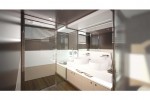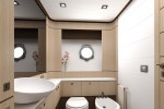 Oak wood has been used in all cabins, adding walnut stained oak wood details at the basis of the walls and in the beside tables. The most distinctive element, which also contributes to highlighting the large hullglazing, is the wide Alcantara headboard which, besides being used to store the curtains, extends all the way to the ceiling covering the entire wall and curving at the sides, thereby “softly embracing” the guests in their sleep – a feeling that is further enhanced by the backlighting found along the entire bulwark. Leather is the main material used for the headboard and the stripe running around the bed.
