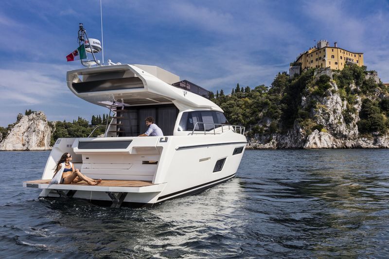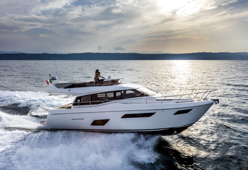 Ferretti Yachts made its comeback in the range under 50 feet with the new flybridge yacht, on display at the Cannes Yachting Festival 2016. Presented in late July at the private preview in Portopiccolo Sistiana, an exclusive marina a few miles from Trieste, Italy, the yacht was created to captivate enthusiasts and owners from all over the globe and it has all the right tools to do so. The flybridge yacht features dynamic lines which give this 45-footer the sporty feel that embodies the latest generation of Ferretti Yachts.