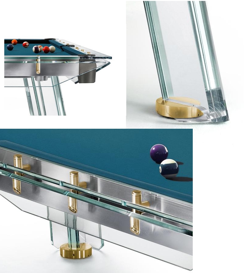 The magic of the table lies within the realized thin steel frame, which is both adjustable, divisible and supports the solidslate game surface, as well as the crystal structure that characterizes the new design. The unique feeling of seeing the billiard table “float” on four legs is complementary to the pleasure of playing on this Italian masterpiece.
