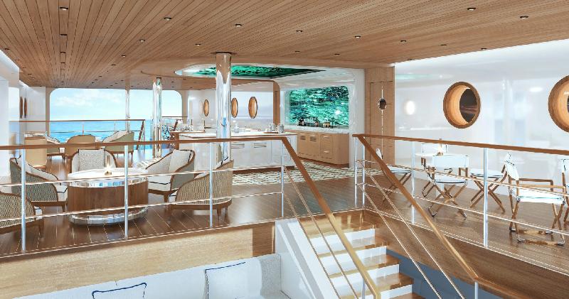 Yet another spectacular design feature onboard is the port-to-starboard transversal marina. Not only is this dual marina a unique engineering masterpiece, but its terraced design also allows the guests to enjoy the sea first hand, with immediate access to water activities, and to “sea limousine” transfers to shore. It can also be transformed into an exclusive dining experience.