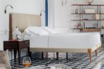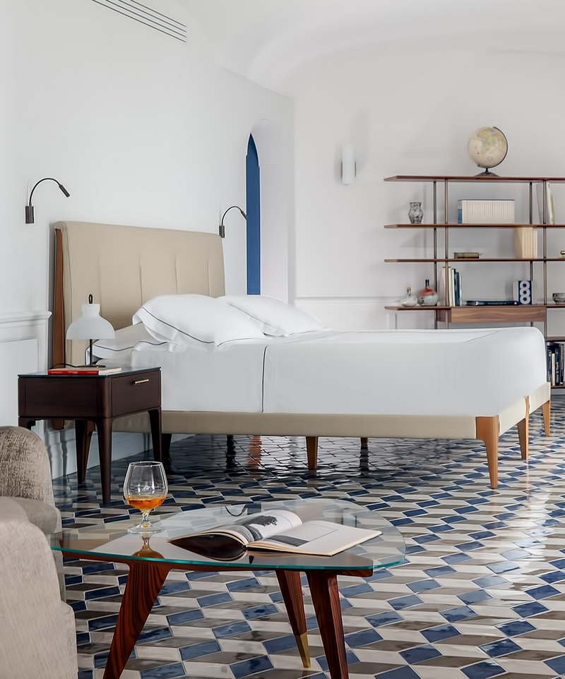 Borgo Santandrea opens with 29 guestrooms and 16 suites, each one offering uninterrupted views of the sea and ancient fisherman’s hamlet of Conca dei Marini. The property has undergone a detailed overhaul over the last three years, combining Mid-Century design details with classic Mediterranean style. White and blue hues feature throughout, alongside geometric hand-painted tiles, antique furniture, and hand-crafted pieces by local Amalfitano artisans. To reach the hotel’s private beach, guests descend the cliffside in a lift, or amble down a series of walkways and staircases amongst fragrant terraced gardens of olive and lemon trees.