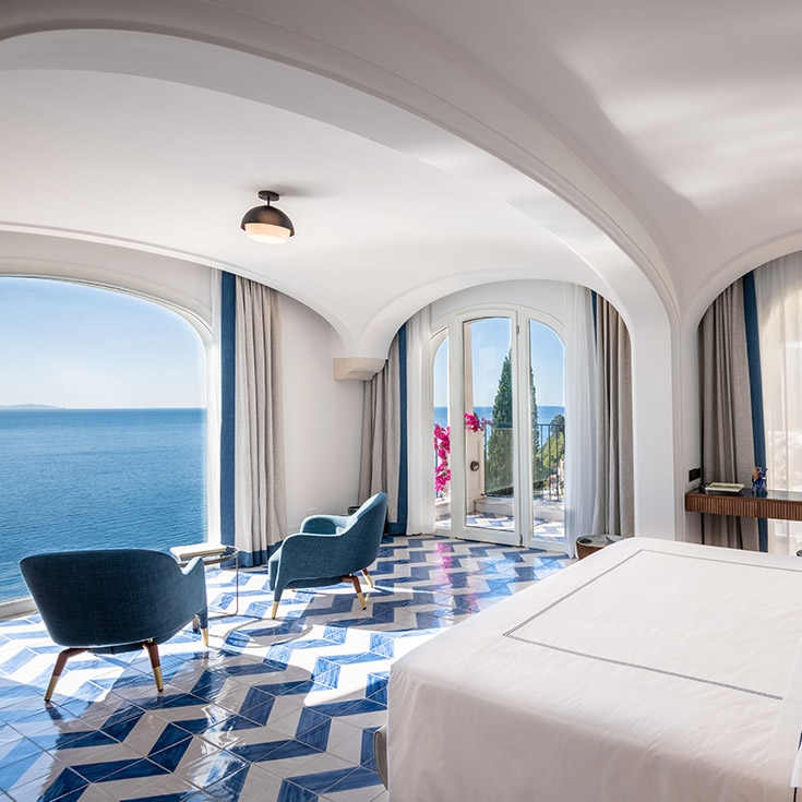 When sourcing rare vintage items for each guest room and suite, the owners sought to restore them with the finest Italian textiles. The intricate blue and white tiles go hand-in-hand with Once Milano linens, Dedar and Rubelli textiles that reflect the far-reaching views of the Tyrrhenian Sea. All rooms and suites are swathed in natural light thanks to floor-to-ceiling windows, while the bathrooms bring the hotel’s fragrant Mediterranean gardens inside with Acqua di Parma toiletries.