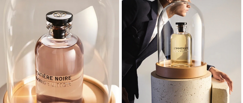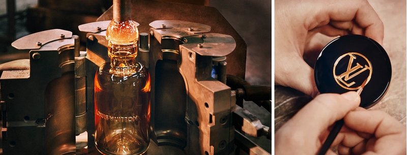 Adding a sculptural dimension that takes inspiration from vintage fragrance displays, the perfume bottle rests majestically on a natural leather base manufactured in Louis Vuitton’s workshops.