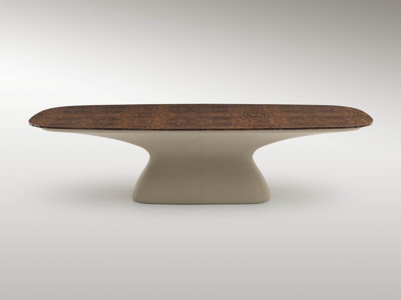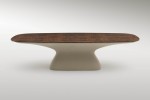 The Alston table is characterised by a juxtaposition of different shapes and volumes. The model’s stand-out feature is its substantial base, upholstered in leather with diamond quilt stitching. The wide table top is available in Ebony Macassar or in the briar-root veneers of the collection with polished, brushed finishes. This contrasts with the matt lacquered skirting, colour co-ordinated with the base.