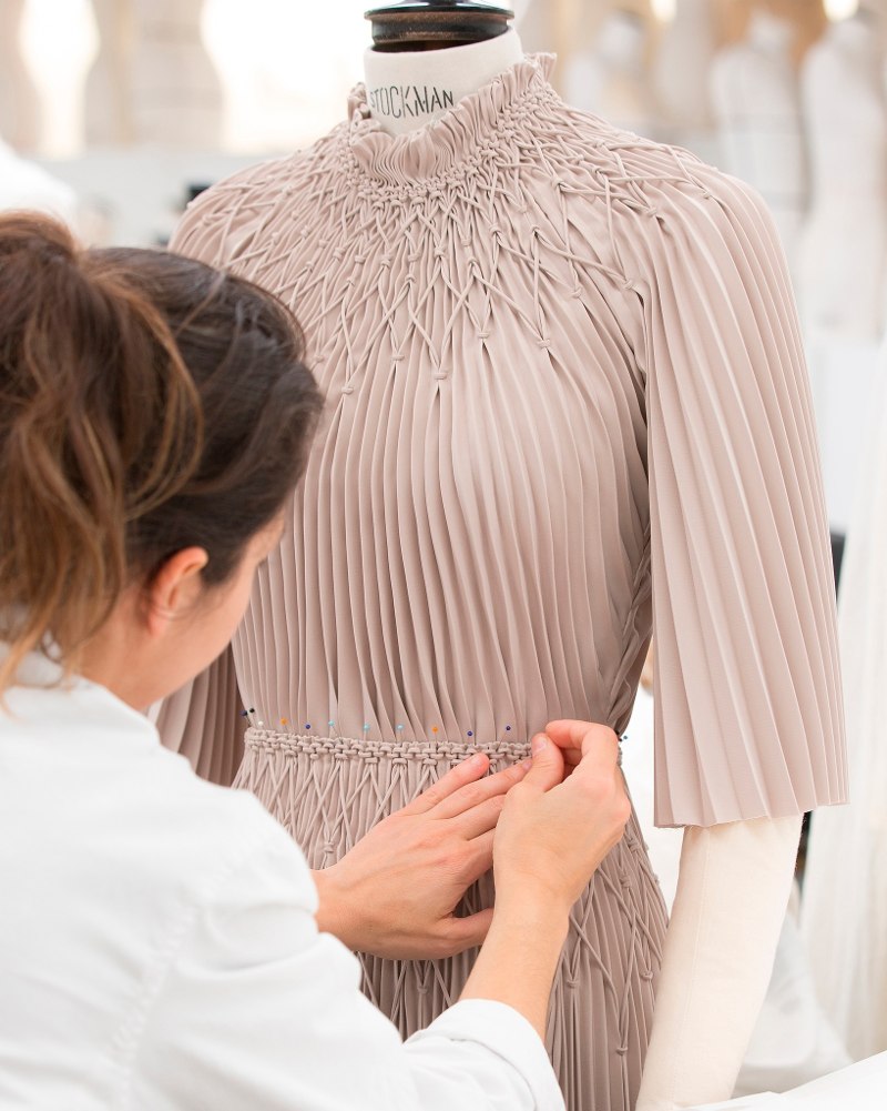 The materials reinterpret the New Look silhouette: the Bar jacket is adorned with a vertically smocked fabric and the skirt is structured with ribbons forming a basque. Hand-loomed fabrics exalt their precious, irregular texture in garments that banish all hems.