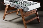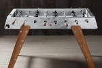 Table football, foosball, biliardino, or futbolin, the table-top game and sport that is loosely based on association football. Here is a Restoration Hardware deluxe game table built of stainless steel and durable iroko wood. The table promises to become a family favorite for years to come. Its handsome design and minimalist palette lend it uncommon sophistication, while its electropolished steel top makes it rugged enough for outdoor use.