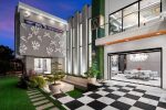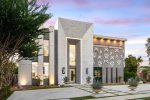 Designed by its builder as his own home, the house is an otherworldly haven for individualists — unbound by convention in every way. Built between 2018 and 2020, it features marble-pattern, Italian porcelain floors throughout, Murano crystal chandeliers in virtually every room, a sleek Ferrari-themed office, a glass-walled garage space viewable from the living room — for displaying a cherished vehicle — a speakeasy/game room with upholstered walls and a showstopper primary suite with a futuristic Versace vibe. Outdoors is equally spectacular, with a checkerboard terrace floor and sunken conversation pit with fire-pit coffee table.