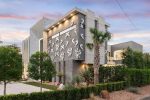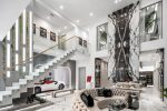 Experimental 3D design programs resulted in the unusual geometric shapes found throughout the home. The two-story living room features a monumental fireplace sheathed in book-matched, marble-effect porcelain slabs and a motorized cradle that can retract an oversized TV into the floor. A massive glass wall panel in the room allows for the full display of one of the vehicles in the three-car garage.