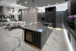 The kitchen has diamond-tread accent panels, quartzite countertops, Italian porcelain flooring and Miele appliances. Its design took cues from TRON: Legacy, too: Its black-and-gray palette was inspired by a flying transport craft known as the Recognizer. The satin-black, diamond-panel exhaust system was designed to resemble the craft itself.