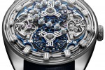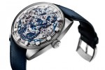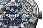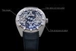 Patents for two display complications are pending – one for the hours display complication, and the other for the circulating tens-of-minutes display. The timepiece is powered by a hand-wound manufacture calibre in 18K gold and features a variable inertia balance wheel. The main base plate is in two parts and separates energy regulation and distribution, from transmission.